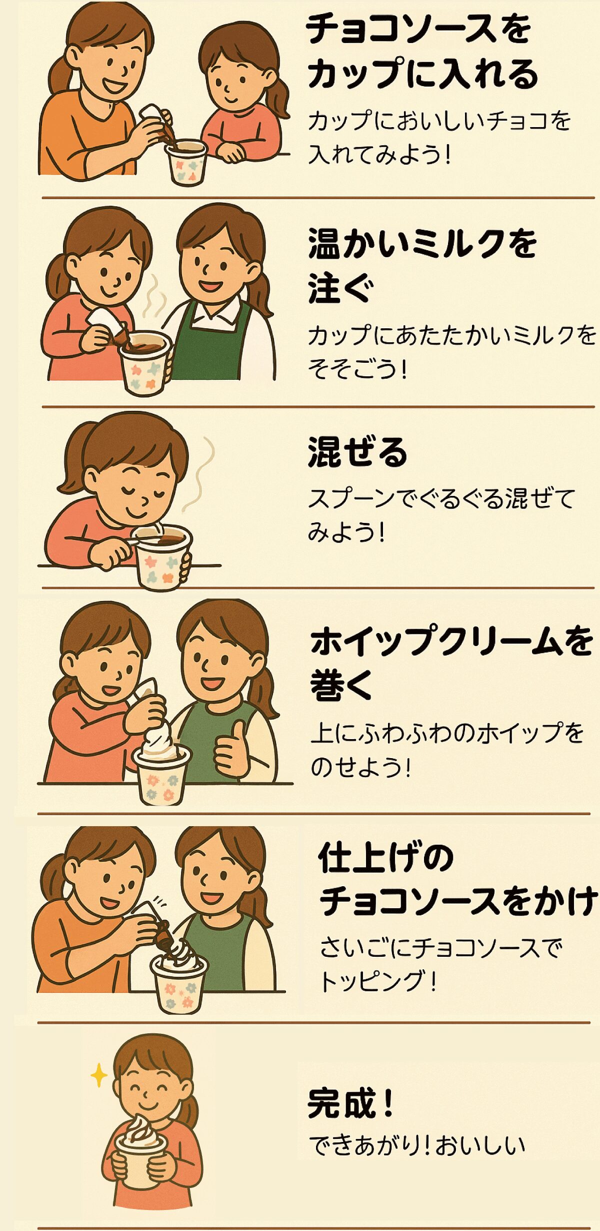 - 思い出に残る:出来上がったココアで記念撮影も楽しめる。