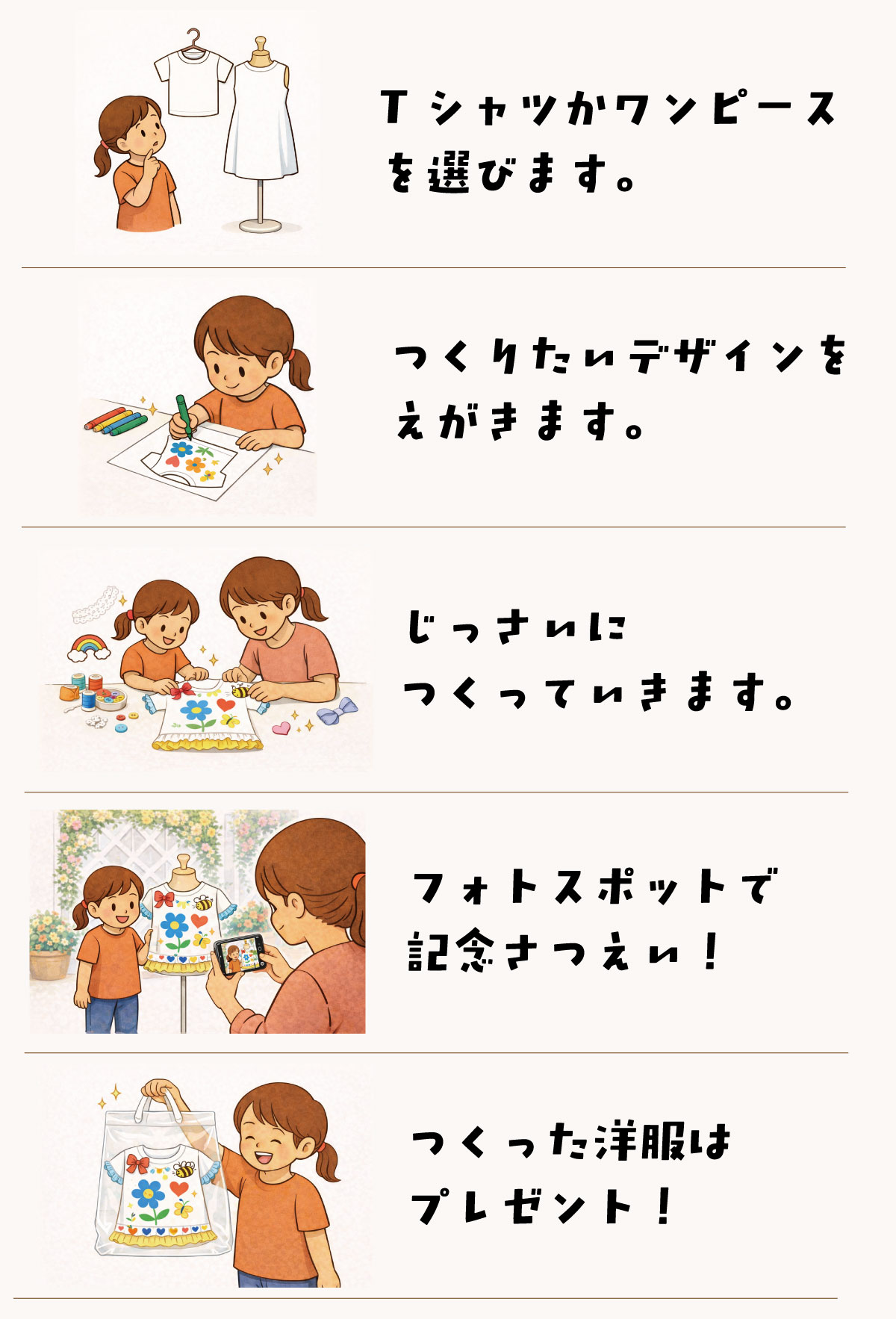 - 思い出に残る:その日に出来上がった服を着て、お出かけ・写真撮影も楽しめる。