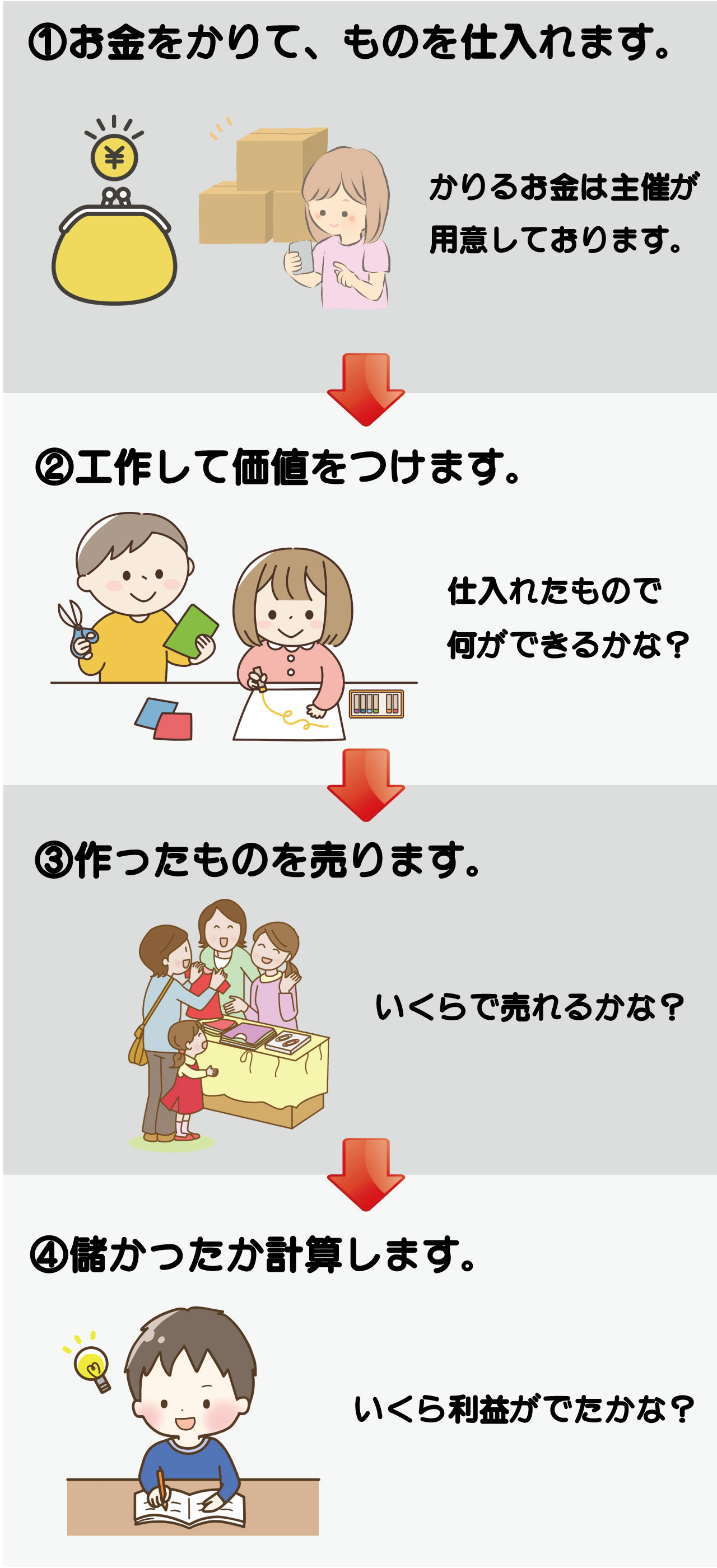 | 参加条件 | 5~12歳のお子さま ※販売の際には保護者様にもご協力いただきます。 (保護者分の参加費用はかかりません) ※4歳以下のお子様は+550円(税込)で仕入れと工作の体験参加が可能です。 |