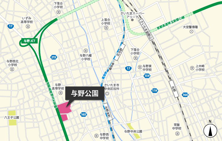 「与野大宮大通り」を右折後、「いずみ高校入口」を右折。再度国道17号新大宮バイパスへ入り、「与野公園」の標識を左折。